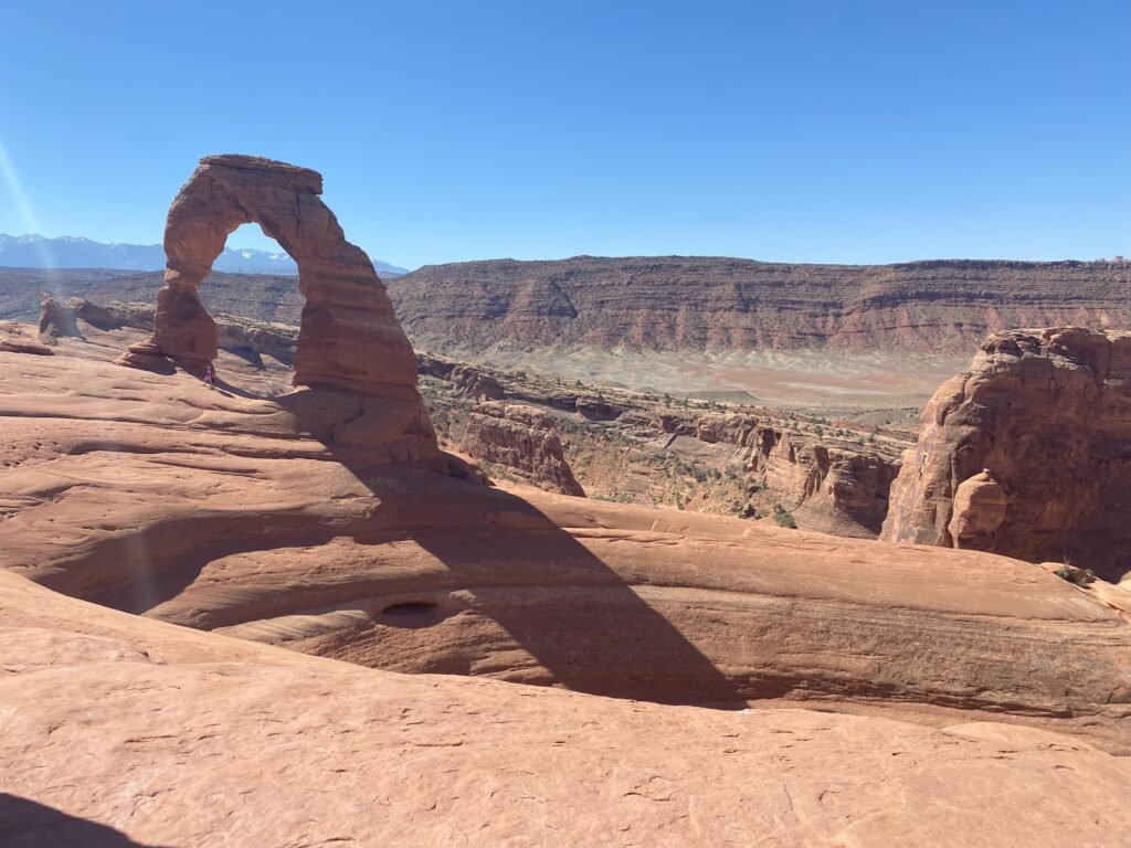 Sunday, June 16 – Our first hike of the day was to Landscape Arch, Tunnel Arch and Pine Tree Arch. Then off to the challenging Delicate Arch Trail. I had been told that there was a portion of the trail that was a little skinny with a drop off. Heights bother me just a little (ok, maybe a lot!), so this had me concerned somewhat. I actually did not have a problem with that section. But no one told me about the huge slab of slick rock – which actually was pretty grippy on my hiking boots. It reminded me of what Half Dome at Yosemite looks like, just not quite as tall and steep. One more stop at Double Arch and Windows Arch and we were done at Arches. The temperature was getting close to 100 degrees and a hamburger was calling my name in the air conditioning in Moab! LOL! We checked in at Field Station in Moab after lunch. This is a newly renovated hotel that caters to outdoor adventurers and van life folks. Our campsite came with showers, pool and community space to stay cool in the late afternoon.